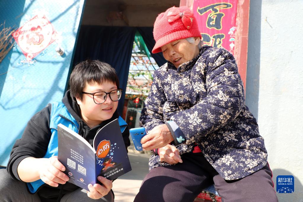 3月2日,在北京市峪口鎮西樊各莊村,王巖峰向老人宣傳反詐知識。