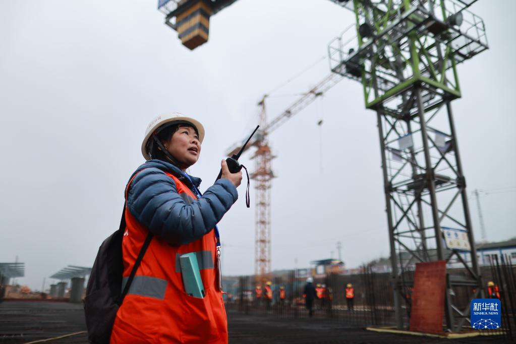 3月7日,中鐵八局女職工劉獻英在告知塔吊司機高鐵通過(guò)時(shí)間。
