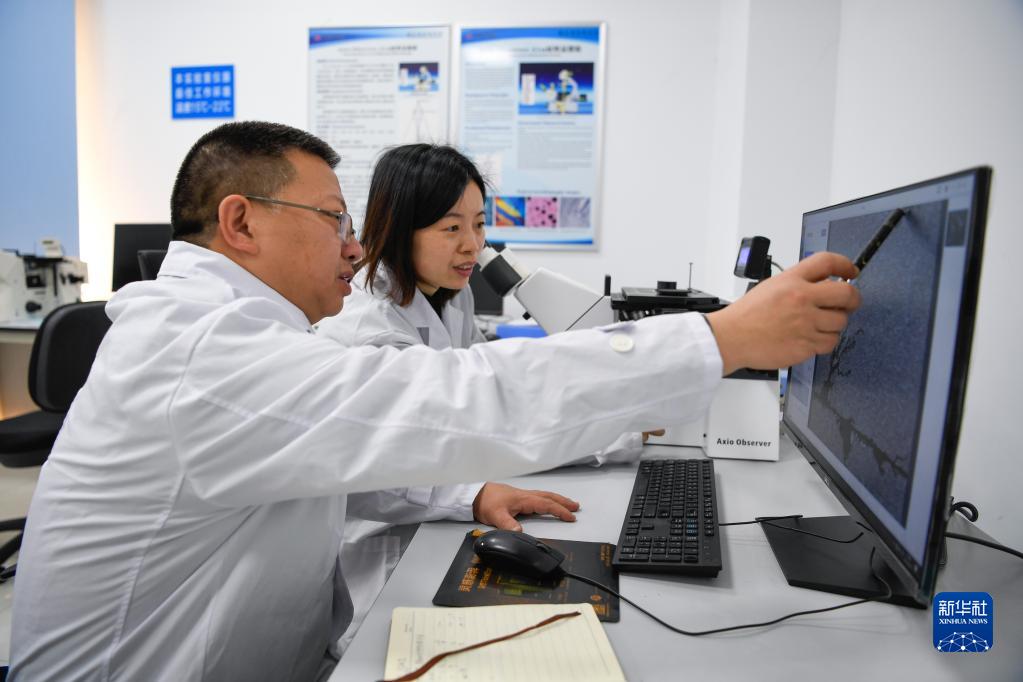 在攀鋼集團研究院,鄒明(左)與同事在實(shí)驗室工作(2月21日攝)。