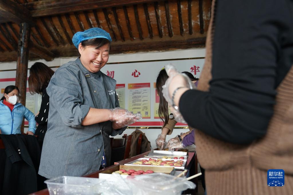 在北京市密云區金叵羅村,“三嫂子”楊紅艷(左)在為來(lái)村參觀(guān)并進(jìn)行小米酥制作體驗的客人示范小米酥制作(2023年3月7日攝)。