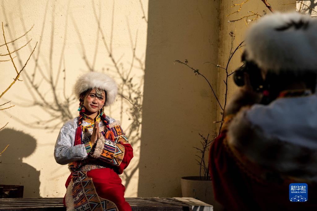 3月8日,游人在獨克宗古城拍照留念。