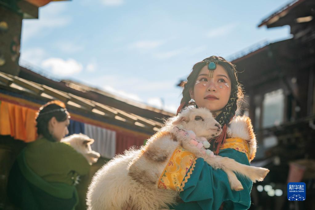 3月8日,游人在獨克宗古城里抱著(zhù)小羊拍照留念。
