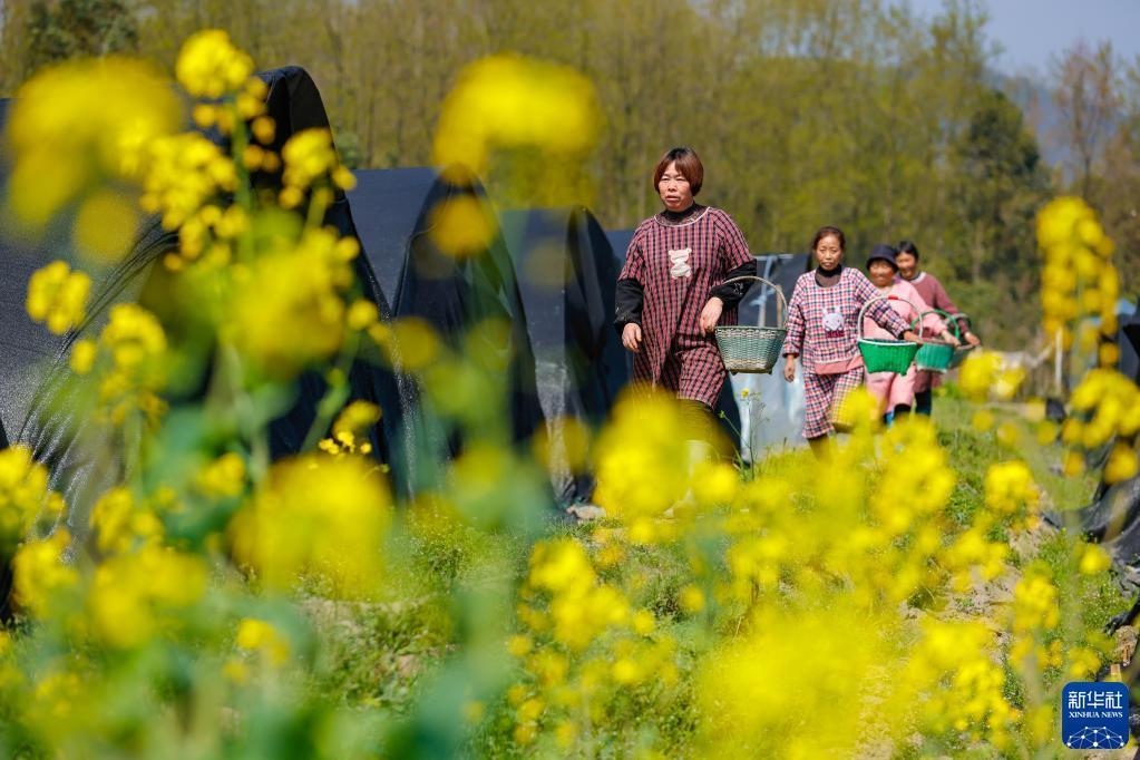 在四川省成都市大邑縣新場(chǎng)古鎮燈籠社區,當地村民行走在種植羊肚菌的大棚旁(3月8日攝)。