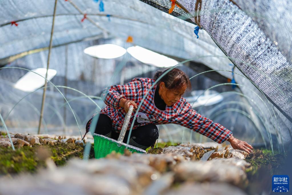在四川省成都市大邑縣新場(chǎng)古鎮燈籠社區的一處種植大棚里,當地村民在采摘羊肚菌(3月8日攝)。