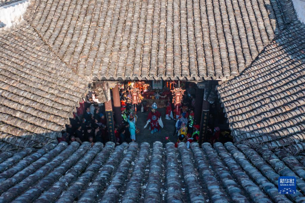 3月10日,在浙江省杭州市淳安縣屏門(mén)鄉屏前村的老祠堂內,人們在觀(guān)看表演(無(wú)人機照片)。