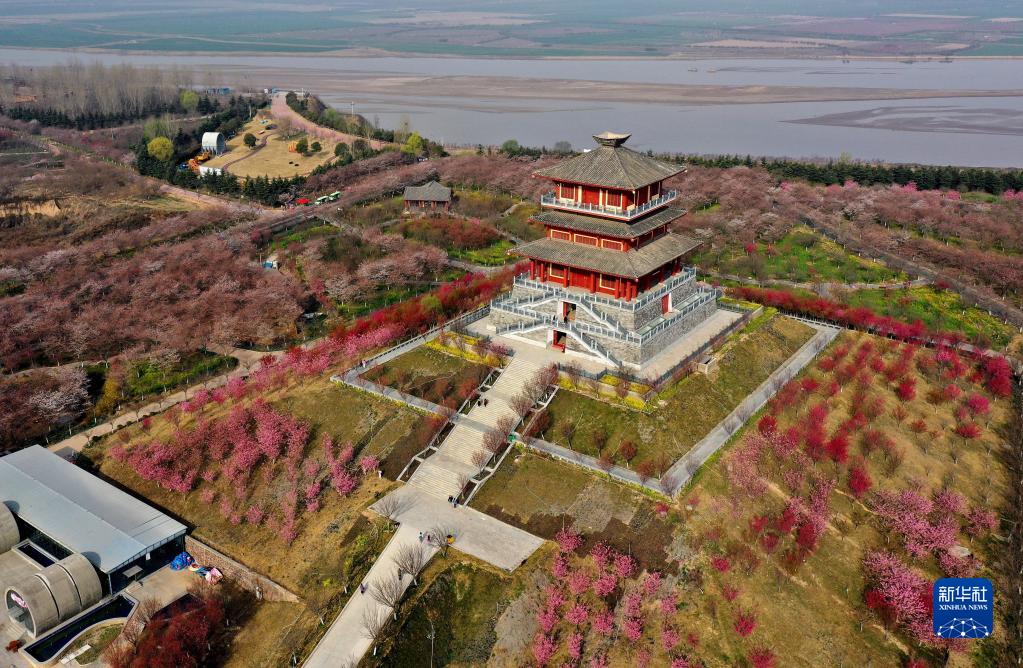 這是3月10日拍攝的位于黃河岸邊的滎陽(yáng)市古柏渡豐樂(lè )櫻花園(無(wú)人機照片)。