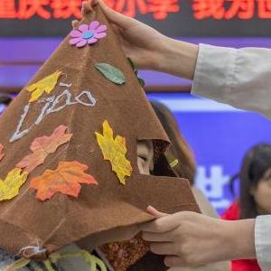 3月10日,重慶市九龍坡區鐵路小學(xué)的學(xué)生們在老師的指導下制作環(huán)保服裝。