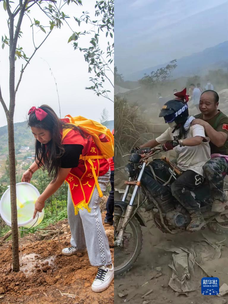 這是一張拼版照片:(左圖)3月10日,在位于重慶市璧山區八塘鎮陽(yáng)龍村的縉云山腳下,“蝴蝶結女孩”吳樸慧在進(jìn)行植樹(shù)活動(dòng)。(右圖)2022年8月23日,吳樸慧駕駛越野摩托車(chē)運送救援人員上山。頭盔上的紅色蝴蝶結成為她獨特的標志。