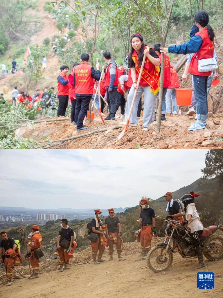 這是一張拼版照片:(上圖)3月10日,在位于重慶市璧山區八塘鎮陽(yáng)龍村的縉云山腳下,“蝴蝶結女孩”吳樸慧(右二)在進(jìn)行植樹(shù)活動(dòng)。(下圖)2022年8月23日,吳樸慧(右一)和救援人員一起奮戰在縉云山抗擊山火的第一線(xiàn),頭盔上的紅色蝴蝶結成為她獨特的標志。