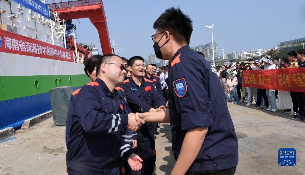3月11日,“探索一號”科考船攜“奮斗者”號全海深載人潛水器抵達三亞,參與科考任務(wù)的科學(xué)家與前來(lái)歡迎的人們握手。