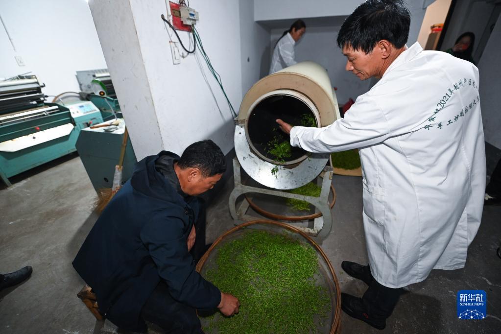 3月22日,趙家鎮東莊村上陽(yáng)自然村“手工茶共富工坊”的致富帶頭人駱煌喜(右)查看高山有機茶的炒制情況。