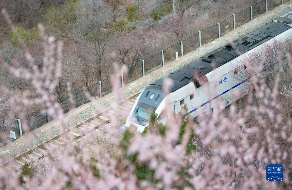 近日,北京居庸關(guān)長(cháng)城腳下山花漸次開(kāi)放。北京市郊鐵路S2線(xiàn)列車(chē)穿行于花海間,成為春日里一道美麗的風(fēng)景。