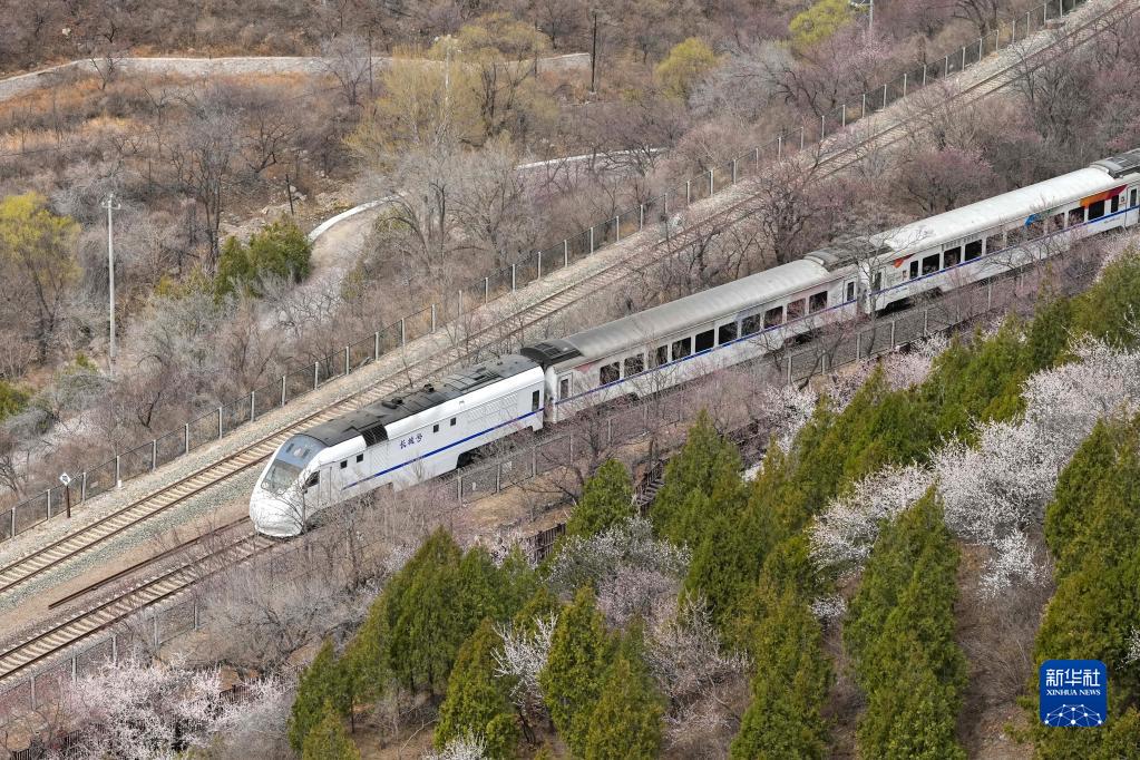 3月23日,一列S2線(xiàn)列車(chē)行駛在居庸關(guān)長(cháng)城腳下花海中。