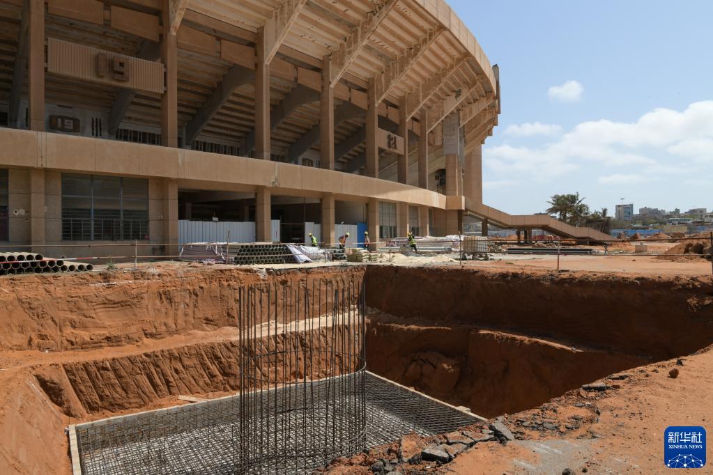 3月22日,工人在塞內加爾首都達喀爾的桑戈爾體育場(chǎng)施工。