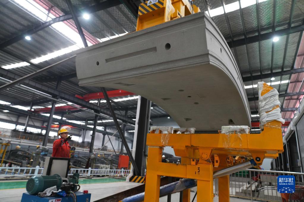 3月24日,工人在中鐵十四局重黔鐵路管片場(chǎng)進(jìn)行管片翻轉作業(yè)。