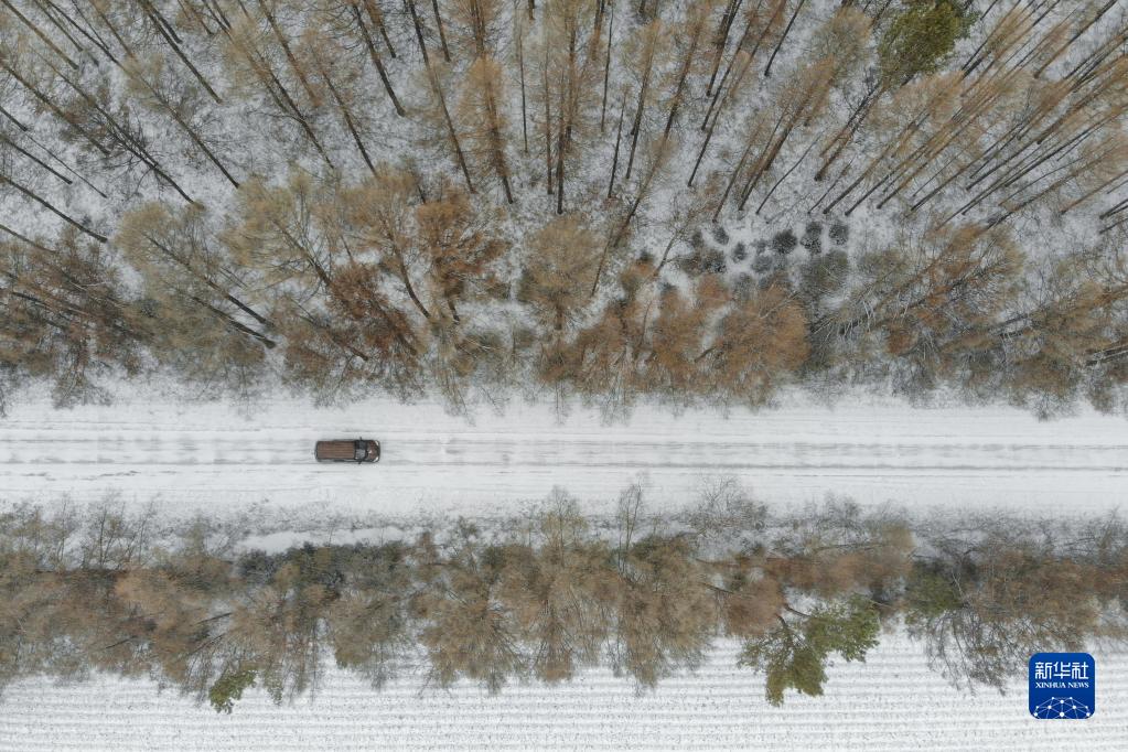 3月23日,在中國龍江森工集團沾河林業(yè)局有限公司施業(yè)區,王劉洋駕車(chē)和妻子徐盼、父親王學(xué)堂一起前往彩芹瞭望塔(無(wú)人機照片)。