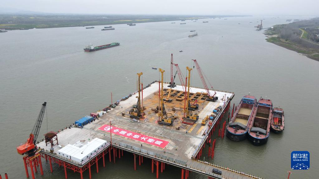 這是中鐵大橋局池州長(cháng)江公鐵大橋首個(gè)主墩開(kāi)鉆現場(chǎng)(3月25日攝,無(wú)人機照片)。