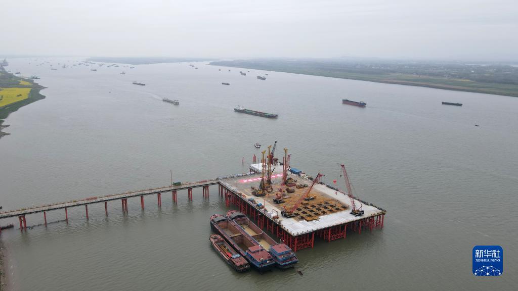 這是中鐵大橋局池州長(cháng)江公鐵大橋首個(gè)主墩開(kāi)鉆現場(chǎng)(3月25日攝,無(wú)人機照片)。