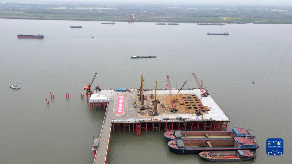 這是中鐵大橋局池州長(cháng)江公鐵大橋首個(gè)主墩開(kāi)鉆現場(chǎng)(3月25日攝,無(wú)人機照片)。