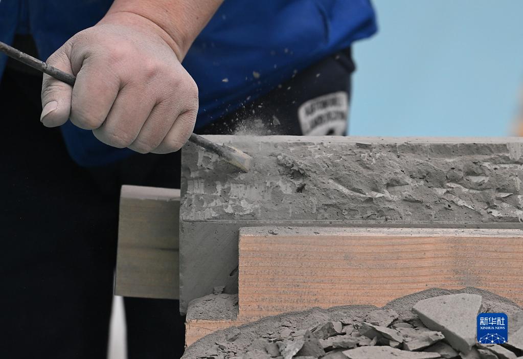 一位參加泥瓦作文物修復師比賽項目的選手運用傳統技術(shù)進(jìn)行建筑材料的加工(3月25日攝)。