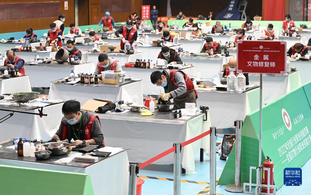 參加金屬文物修復師比賽項目的選手在現場(chǎng)進(jìn)行文物修復(3月24日攝)。