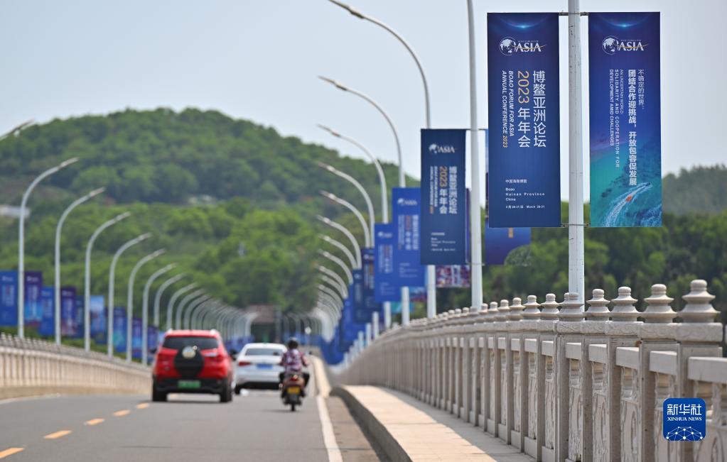 這是博鰲大樂(lè )大橋上的博鰲亞洲論壇2023年年會(huì )主題宣傳牌(3月25日攝)。