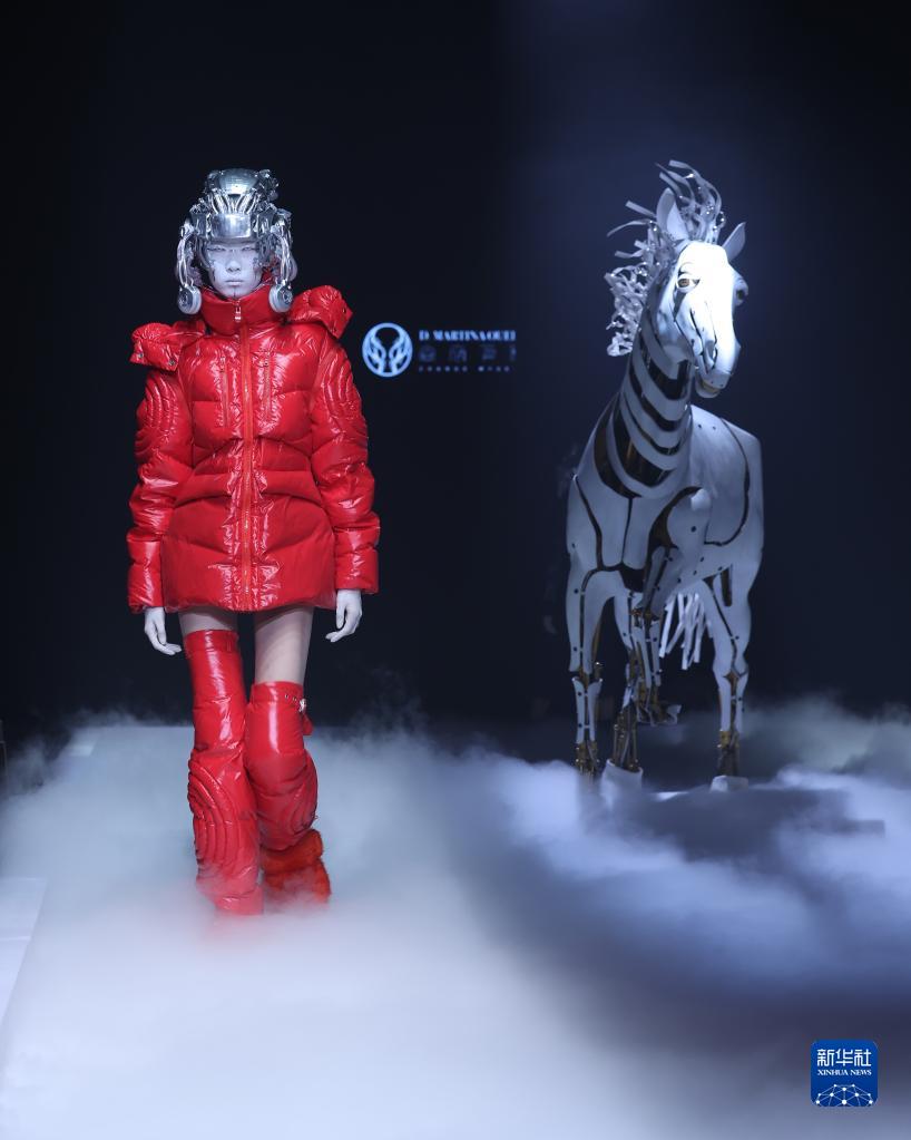 當日,主題為“視界·邊界”的時(shí)裝秀在北京舉行的中國國際時(shí)裝周2023秋冬系列上上演。設計師丁潔以婦好鸮尊為設計靈感,模特佩戴3D打印發(fā)飾,繞行秀場(chǎng)特別設置的“戰馬”,上演了一場(chǎng)歷史與未來(lái)“時(shí)空對話(huà)”的時(shí)裝秀。