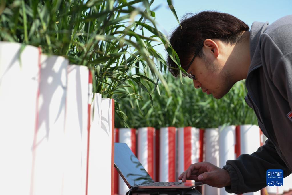 3月26日,在皖中綜合試驗站內,安徽農業(yè)大學(xué)農學(xué)院的學(xué)生在測量小麥的生長(cháng)指標。