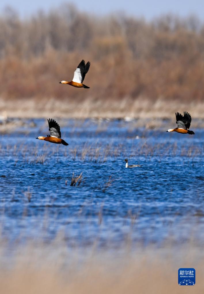 3月27日,赤麻鴨在孟家段國家濕地公園飛翔。