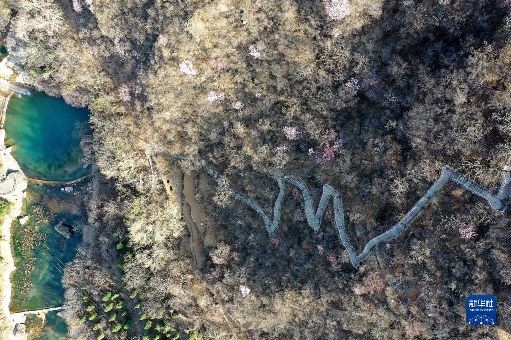 村民們走在修好的旅游步道上(2023年3月10日攝,無(wú)人機照片)。新華社記者 詹彥 攝
