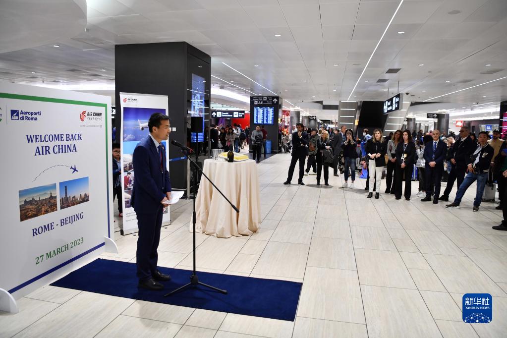 3月27日,在意大利羅馬菲烏米奇諾機場(chǎng),人們參加國航羅馬至北京直飛客運航線(xiàn)復航儀式。