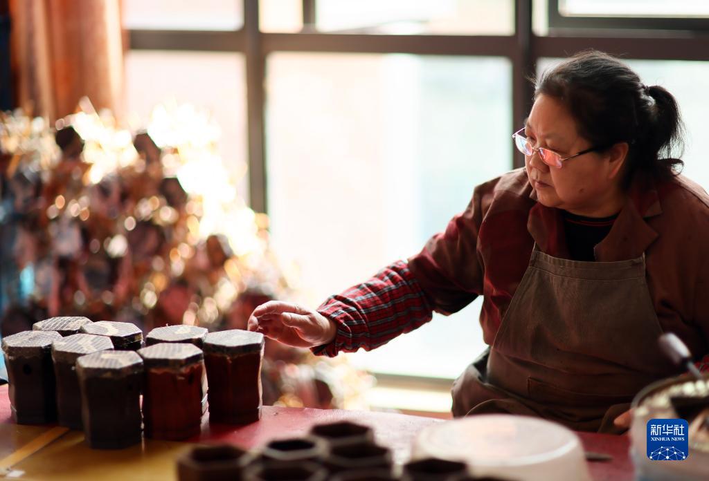 3月28日,在江蘇無(wú)錫梅村街道二胡產(chǎn)業(yè)園,工人在制作琴皮。