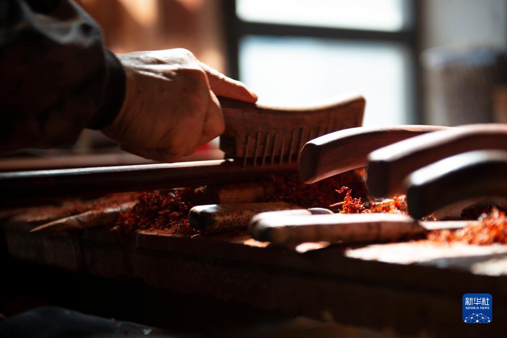 3月28日,在江蘇無(wú)錫梅村街道二胡產(chǎn)業(yè)園,工人在制作琴桿。