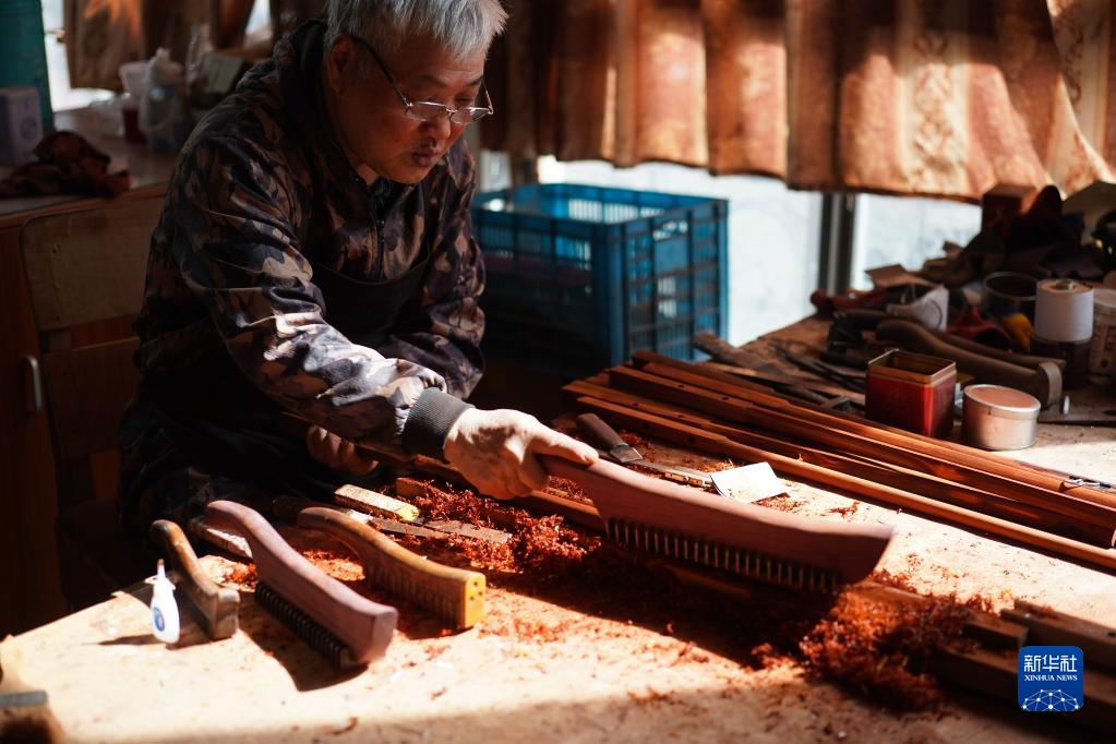 3月28日,在江蘇無(wú)錫梅村街道二胡產(chǎn)業(yè)園古月琴坊車(chē)間,工人在制作二胡。