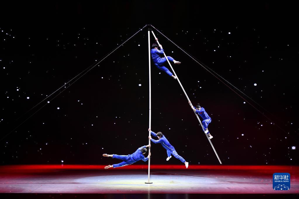 3月28日,在位于山東省濟南市的山東省會(huì )大劇院,演員表演雜技節目《逐夢(mèng)空天·男女集體爬桿》。