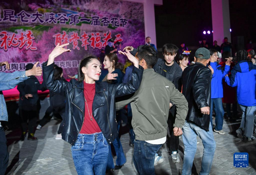 3月27日,游客和村民在新疆阿克陶縣塔爾塔吉克民族鄉巴格艾格孜村跳舞。