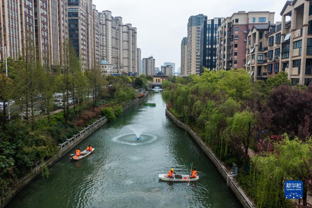 3月29日,龍泉街道工作人員乘船在市陌河里投放螺螄,改善水質(zhì)(無(wú)人機照片)。