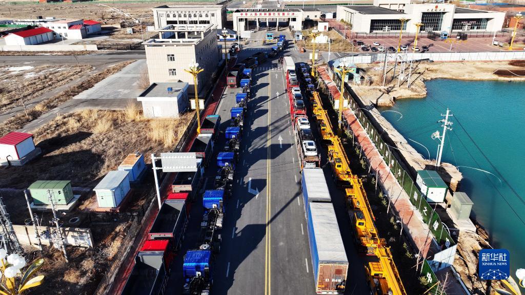 3月29日,來(lái)自哈薩克斯坦的貨車(chē)和即將出口的車(chē)輛在巴克圖口岸執勤民警引導下有序出境(無(wú)人機照片)。