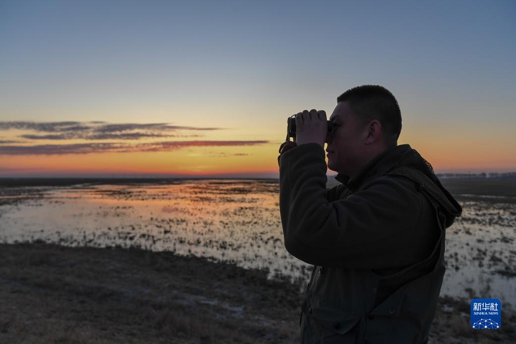 3月29日,在吉林省白城市鎮賚縣濕地,中國野生動(dòng)物保護協(xié)會(huì )吉林白城護飛隊隊員王凱觀(guān)察候鳥(niǎo)棲息狀態(tài)。