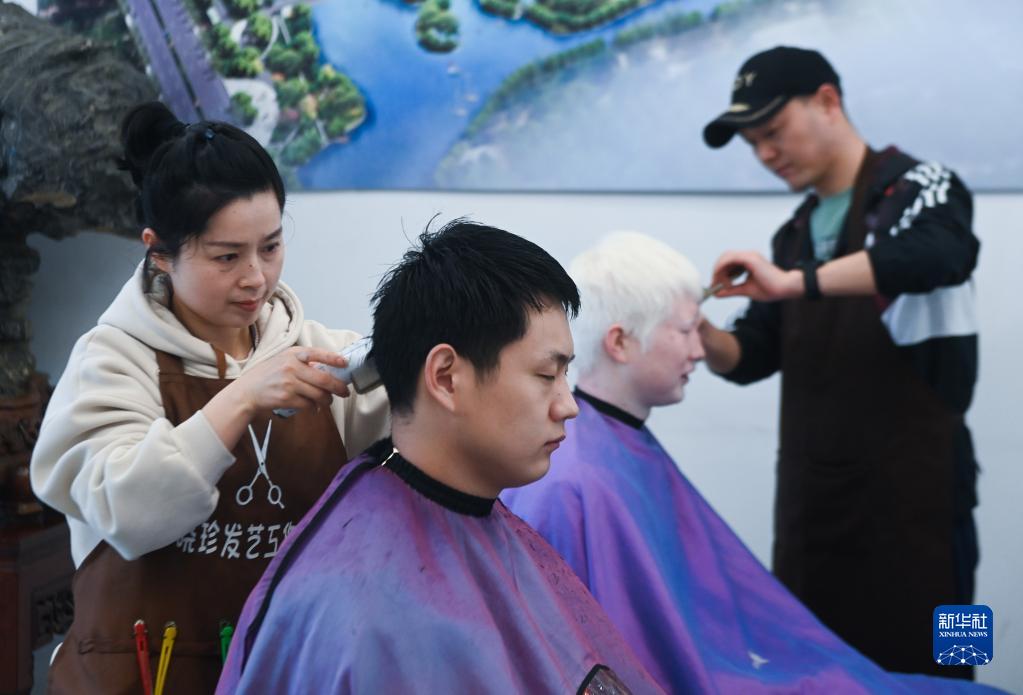 3月30日,聾啞人王曉珍(左一)和丈夫董華良在給盲人門(mén)球隊的隊員們義務(wù)理發(fā)。