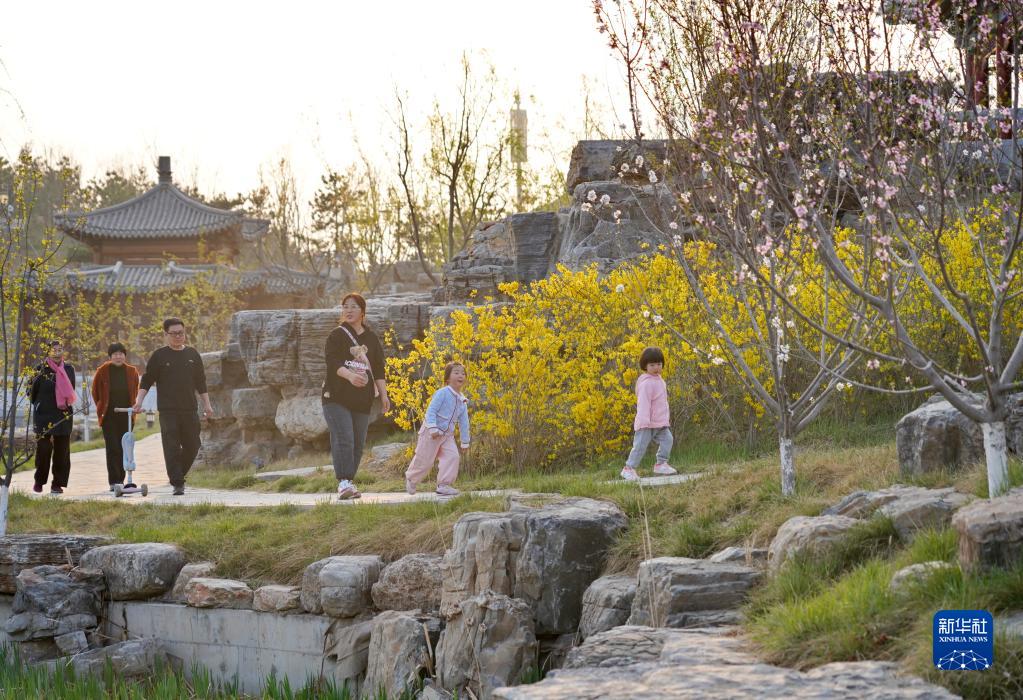 市民在雄安新區悅容公園游玩(3月30日攝)。