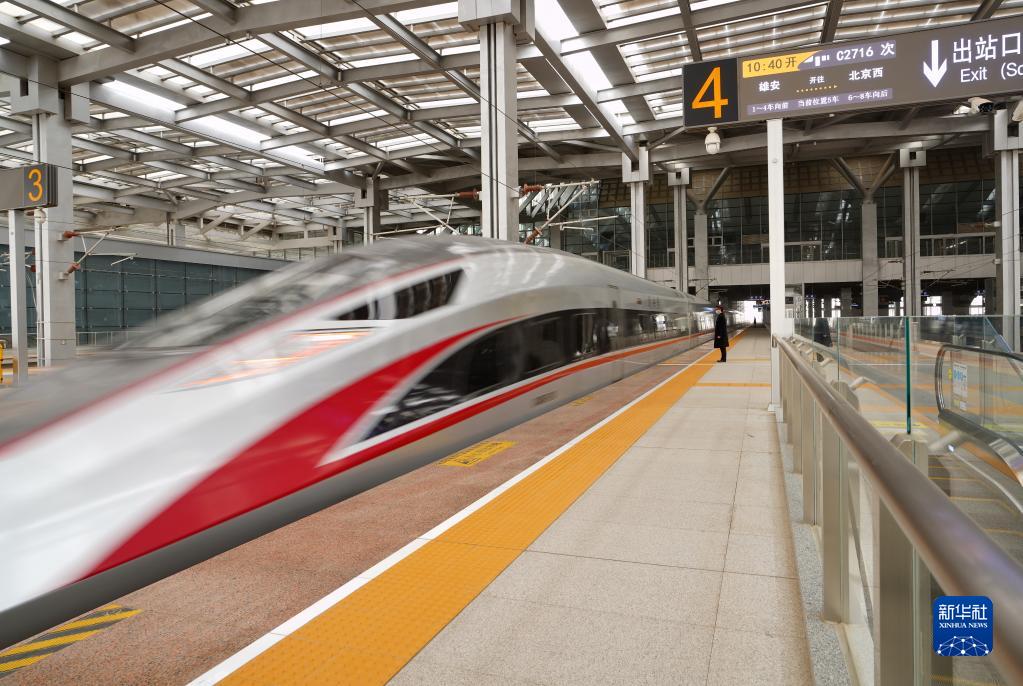 一輛高鐵列車(chē)駛離京雄城際鐵路雄安站,開(kāi)往北京(3月22日攝)。