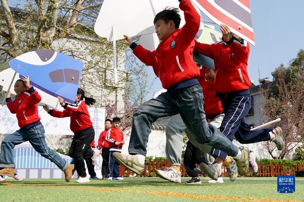 3月31日,徐州市漢橋小學(xué)的學(xué)生進(jìn)行“列車(chē)競速”游戲。