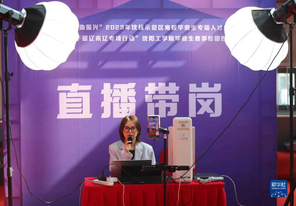 3月31日,在沈陽(yáng)工學(xué)院體育館,直播帶崗專(zhuān)區工作人員通過(guò)網(wǎng)絡(luò )平臺對雙選會(huì )進(jìn)行直播,滿(mǎn)足不能到場(chǎng)學(xué)生的就業(yè)需求。