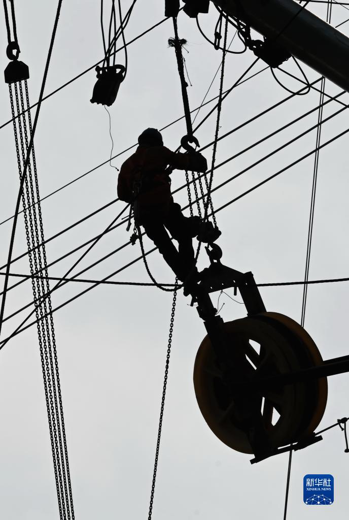 當日,在福建漳州核電500千伏送出工程施工現場(chǎng),施工人員在橫跨1500米的漳江跨越線(xiàn)路百米上空進(jìn)行四回線(xiàn)路同時(shí)跨江作業(yè),全力推進(jìn)工程進(jìn)度。