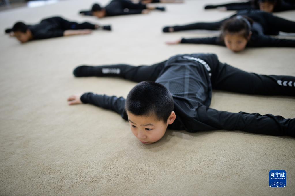 3月31日,小演員們在位于江蘇省鹽城市建湖縣的江蘇省雜技團訓練。