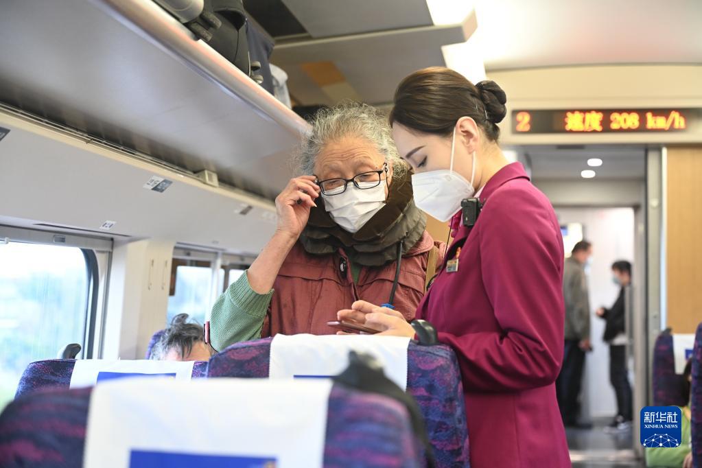 4月1日,中國鐵路南昌局集團有限公司福州客運段乘務(wù)員杜淼(右)在核對赴港旅客信息。