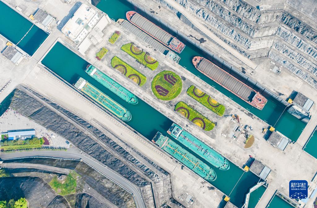 4月1日,船舶有序通過(guò)三峽雙線(xiàn)五級船閘(無(wú)人機照片)。