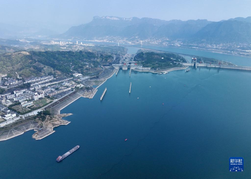4月1日,船舶準備通過(guò)三峽雙線(xiàn)五級船閘(無(wú)人機照片)。