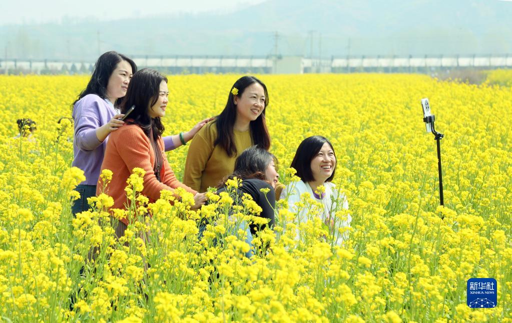 4月1日,游客在汝陽(yáng)縣三屯鎮東保村千畝油菜花田拍照留念。